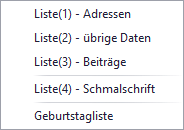 In einem Untermenü werden beim Aufruf von [Mitgliederlisten] folgende Funktionen angezeigt: