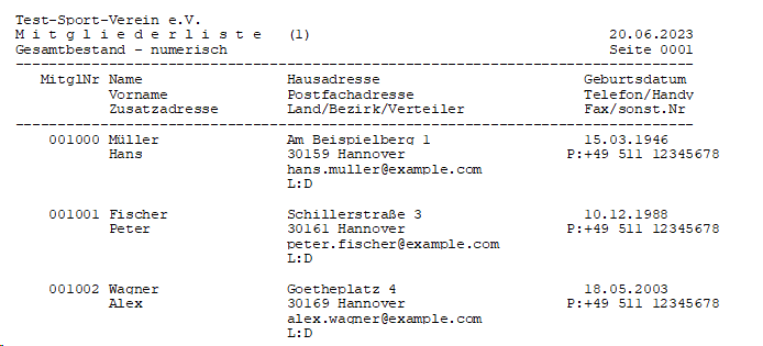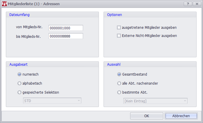 Generell können bei jeder Mitgliederliste ausgetretene Mitglieder wahlweise mit ausgegeben werden. Bei diesen Mitgliedern erfolgt hinter der Mitgliedsnummer eine Kenntlichmachung mit ' * '.