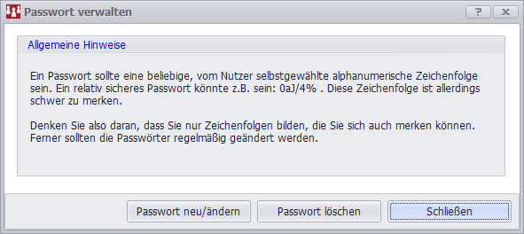 Generell wurde im Rahmen der Passwortänderungsdialoge auf eine erneute Passworteingabe nach erfolgreicher Mandantenanmeldung verzichtet. Unseres Erachtens ist die Legitimation bei Aufruf des Bestandes ausreichend.