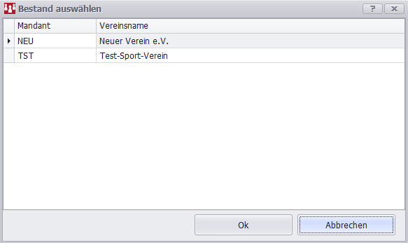 Nach erfolgreichem Start des Programm erscheint die Bestandsauswahl, aus der Sie per Doppelklick Ihren gewüschten Bestand/Mandant auswählen können. Nach der Erstinstallation wird automatisch der TST-Mandant aufgelistet. Dieser Mandat dient als Vorlage- und Testbestand, an dem Sie alles testen können, ohne Ihren eigenen Bestand zu verändern. Wir empfehlen Ihnen, wenn Sie SPG-Verein noch nicht kennen, einfach mal einen Blick in diesen Bestand zu werfen. Dort finden Sie u.a. Beispiele zur Beitragsstruktur oder dem Einsatz der Abrechnungen.