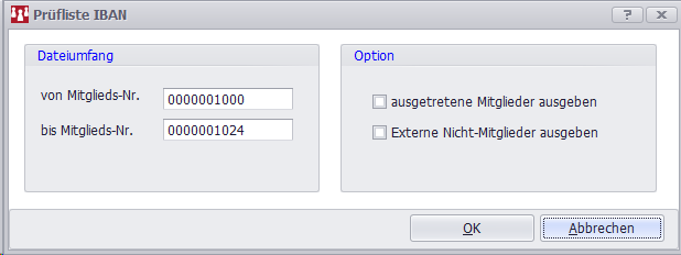Diese Programmfunktion durchsucht den gesamten Datenbestand des ausgewählten Mandanten auf Korrektheit der IBAN/BIC. Optional können auch die ausgetretenen Mitglieder mit einbezogen werden.