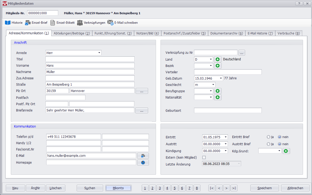 Neben dem Feld der Mitgliedsnummer wird von diesem Datensatz der Name nebst Adresse nachrichtlich eingeblendet.