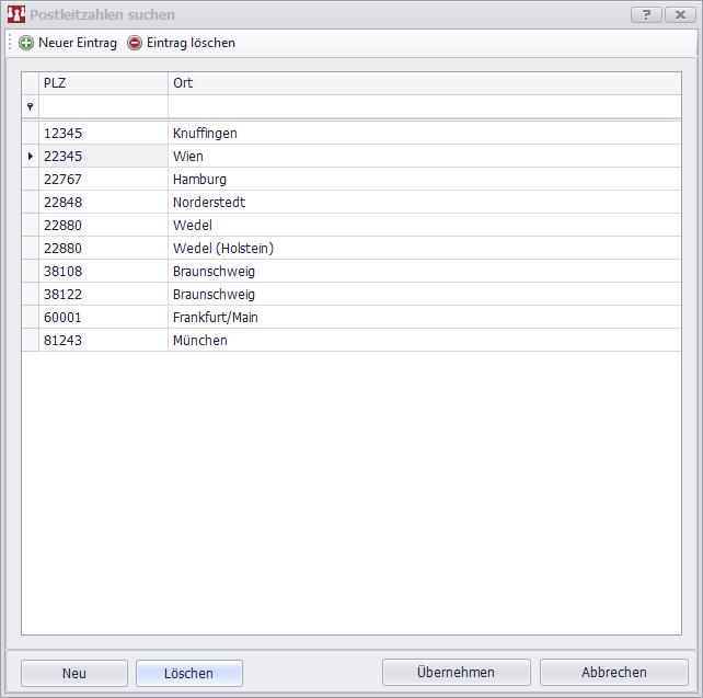 In der Datenbank werden die schon eingegebenen Kombinationen aus PLZ und Ort gespeichert; dies werden u.a. bei der Konvertierung aus einer 3.x-Version gespeichert.
