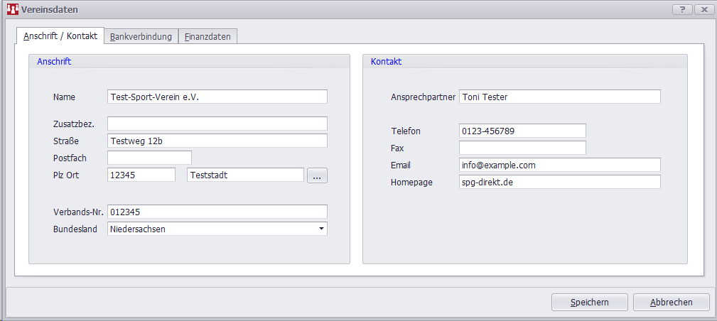 Felder zur Bildung der Vereinsanschrift. Diese Inhalte haben rein informativen Charakter; lediglich unter Funktionen, in denen eine Brieferstellung erfolgt, werden sie je nach Vorgabe für den Briefkopf benötigt.
