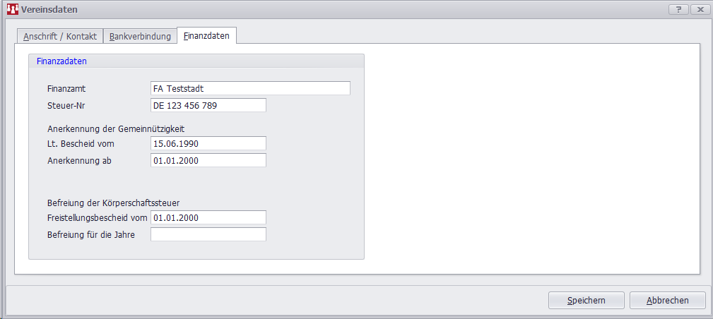 Unter diesem Punkt besteht die Möglichkeit Angaben, wie z.B. zuständiges Finanzamt und Steuer-Nr. sowie Angaben zur Gemeinnützigkeit und zur Befreiung von der Körperschaftsteuer vorzunehmen