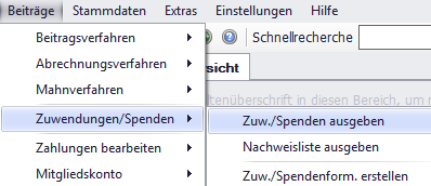 Aufgrund von Gesetzesänderung der vergangenen Jahre müssen für die Zuwendungsbescheinigungen bestimmte Voraussetzungen erfüllt werden. Diesem Umstand ist hier Rechnung getragen worden. Der Menüpunkt erlaubt dem Benutzer, durch Auswahl des entsprechenden Untermenüpunktes entweder eine Zuwendungsbestätigung (Spendenquittung) oder eine Nachweisliste anzufertigen.