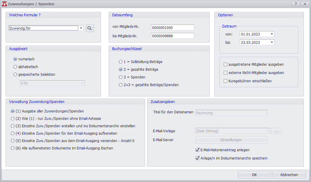 Der Benutzer hat hier - wie bekannt - die Wahlmöglichkeit bezüglich der Ausgabeart und des Dateiumfanges. Bei der Auswahl des Formulars über das einzeilige Listenfeld können nur bestimmte Formulare (z.B. 'zuwendg.for') genutzt werden.