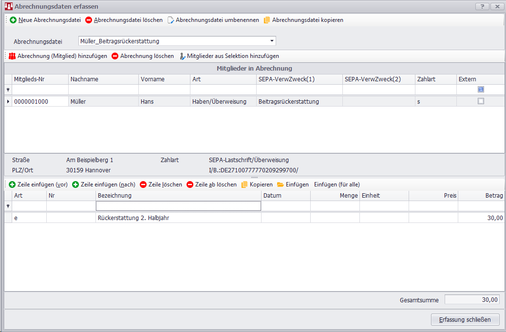 Jetzt haben alle Mitglieder die Abrechnungszeile mit der Beitragsrückerstattung hinterlegt und die Erfassung kann beendet werden.