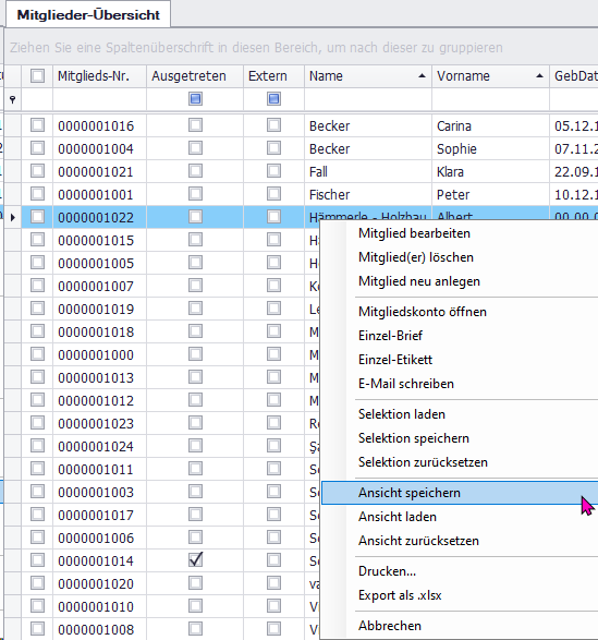 Klicken Sie dafür in der Mitglieder-Übersicht mit der rechten Maustaste auf '"Ansicht speichern".