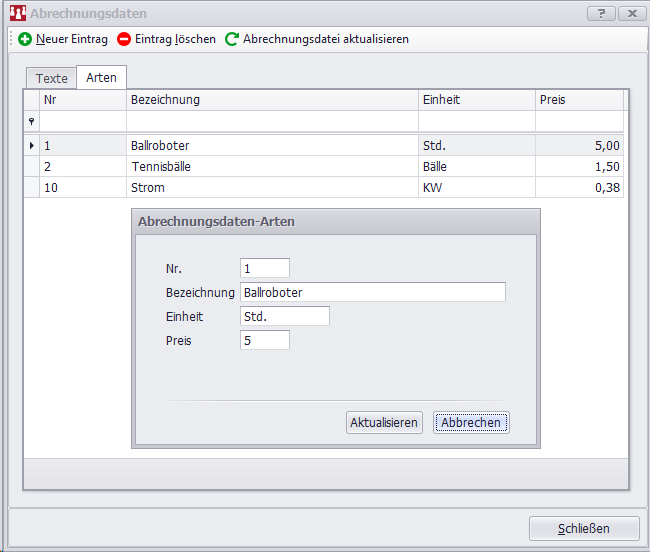 Sie können Änderungen an den Abrechnungsart vornehmen. Durch Doppelklick auf eine Abrechnungsart gelangen Sie in das Bearbeitungsfenster für die Abrechnungsart.