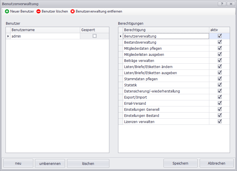 Um die Benutzer und deren Berechtigungen zu verwalten, ist der Menüpunkt "Extras" > "Benutzerverwaltung" aufzurufen.