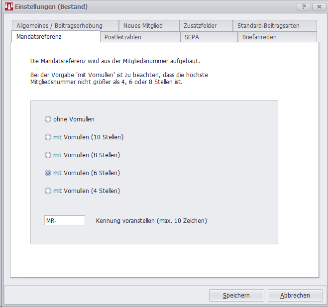 Sie können eine Syntax vorgeben, nach der die Mandatsreferenz gebildet werden soll.