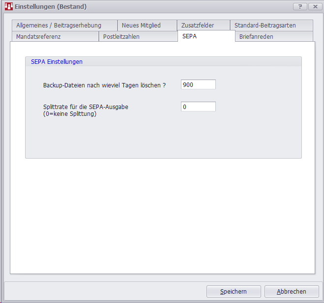 Sie können einen Default-Wert für die Splitrate vorgeben; dieser wird bei "SEPA-Datei erstellen" als Vorgabe genutzt.