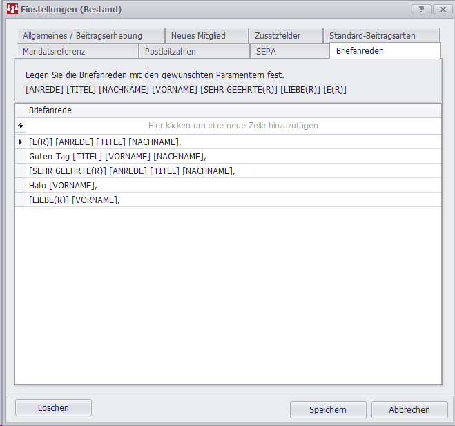 Sie können hier individuelle Briefanreden definieren, die Sie dann bei dem Mitglied hinterlegen können.