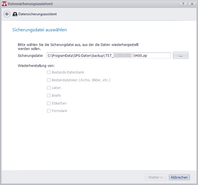 Das Programm zeigt durch Setzen der Häkchen an, welche Datengruppe(n) in der Sicherung enthalten ist. Sie haben die Möglichkeit, diese automatische Gruppenauswahl zu ändern.