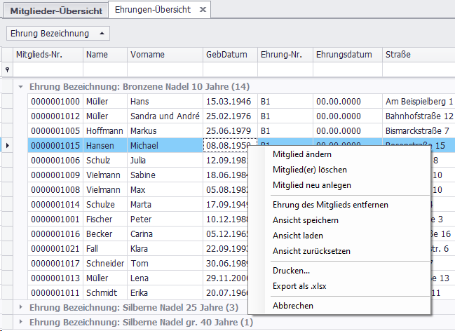 Hinter der Ehrung-Bezeichnung bekommen Sie angezeigt, wieviel Mitglieder eine entsprechende Ehrung erhalten haben.