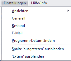 Der Hauptmenüpunkt [EINSTELLUNGEN] bündelt übersichtlich alle grundlegenden Einstellmöglichkeiten des Programms an sich und des jeweils aktiven Bestandes. Einmal an diesen Stellen gemachte Eingaben werden an vielen Stellen in der Anwendung verwendet und sollten deshalb sorgfältig und mit Bedacht gewählt werden.