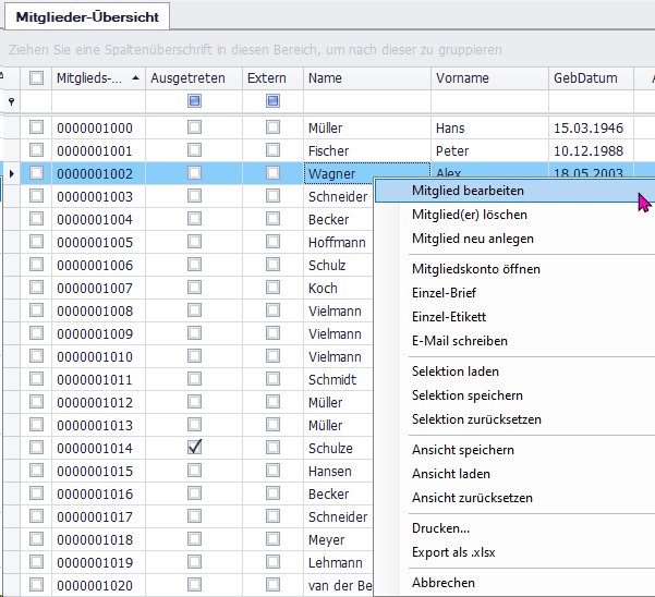 Durch Doppelklick auf ein Mitglied bekommen Sie dieses in der Detailansicht angezeigt. Über das Kontextmenü stehen Ihnen zahlreiche andere Programmfunktionen zur Verfügung. Die meissten von diesen Funktionen sind schon an andere Stelle in dieser Hilfe erläutert, bitte informieren Sie sich dort über die entsprechende Funktion.