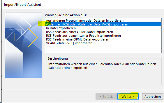 - "iCalendar. (ICS) oder .... importieren" auswählen.