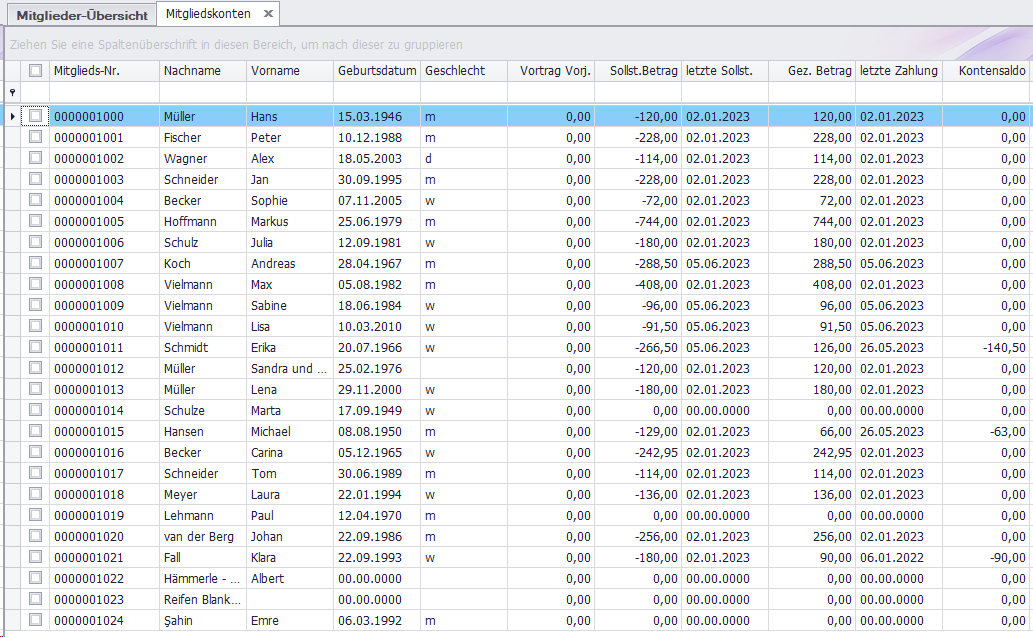 Im Kontextmenü oder Doppelklick auf das gewünschte Mitglied, wird das Mitgliedskonto geöffnet. Sie können auch über das Kontextmenü das Dialogfenster zum Drucken der Mitgliedskonten aufrufen.