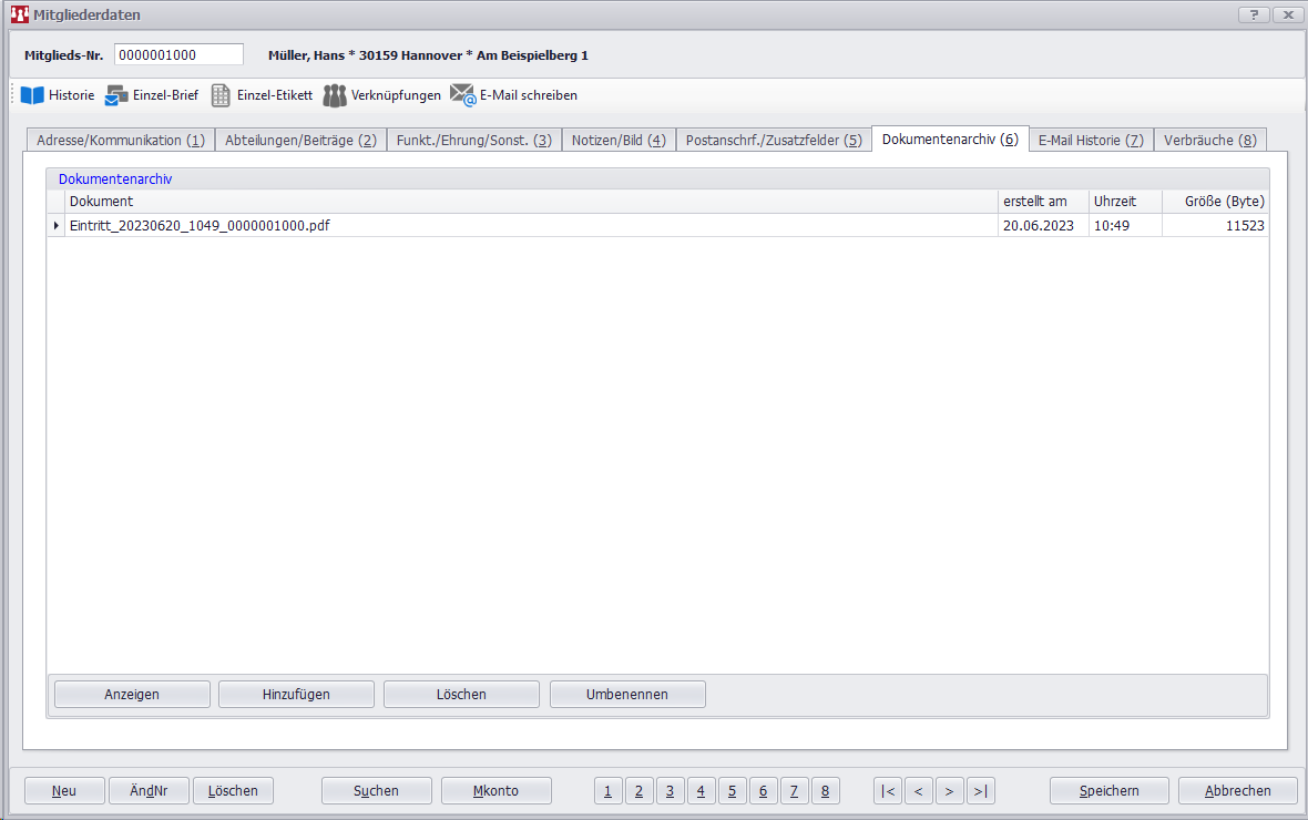 Im Mandantenverzeichnis wurden bisher z.B. durch den Benutzer geladene Bilder abgelegt. (…\tst\bilder). An der gleichen Stelle kommt nun das Verzeichnis ‚archiv’ (…\tst\archiv) als Strukturierungsverzeichnis hinzu. Sollten jetzt zu einem Mitglied Dokumente abgelegt werden, wird in dem Verzeichnis ‚archiv’ ein weiteres Unterverzeichnis mit der jeweiligen Mitgliedsnummer als Verzeichnisname angelegt. Die vom Anwender ausgewählte Datei wird dann systemseitig in dieses neu angelegte Verzeichnis kopiert. Auf diese Weise wird sichergestellt, dass die Originale stets an ihrem Ursprungsort verfügbar bleiben.