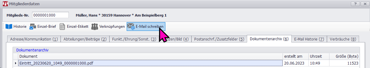 Des weiteren können Sie auch Dokumente aus dem Dokumentenarchiv per E-Mail versenden. Wählen Sie dafür einfach ein Dokument mit der linken Maustaste aus und klicken dann oben in der Button-Leiste auf "E-Mail schreiben"