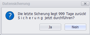 Der Benutzer hat hier die Möglichkeit, durch Betätigen der Schaltfläche ’Ja’ direkt zum Menüpunkt [Datensicherung] zu verzweigen, oder durch Betätigen der Schaltfläche ’Nein’ das Programm zu beenden. Der Standard-Warnwert ist individuell einstellbar; dafür ist der Menüpunkt [EINSTELLUNGEN] [Einstellungen (generell)] und dort die Registerkarte „Sonstiges“ aufzurufen: