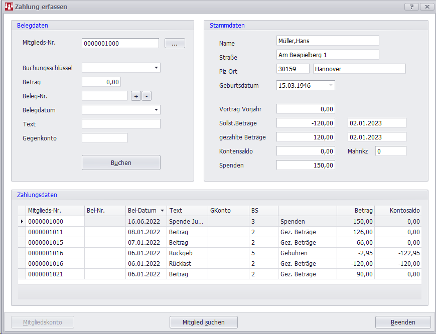 Unter dieser Funktion können alle Zahlungen manuell gebucht werden, die aus der Beitragserhebung als offene Posten resultieren; weiterhin sind Bestandskorrekturen möglich. Für die erfassten Beträge erfolgt eine Verrechnung mit den entsprechenden Feldern aus den Mitgliedsdaten.